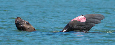 After watching the Orca do a circuit of the Cove, Knight Inlet Lodge guests enjoyed some aerial behaviour with one of the individuals breaching, or launching its body completely out of the water, three times and some tail slapping as well. One of our guides and researchers, John Kitchen, was able to capture a breach on camera. A Stellar Sea Lion with a sizeable pectoral flipper wound was spotted swimming around the Cove with its injured limb elevated a few hours after the Orca departed – possibly acquired during a near miss with a Transient? We can only guess!