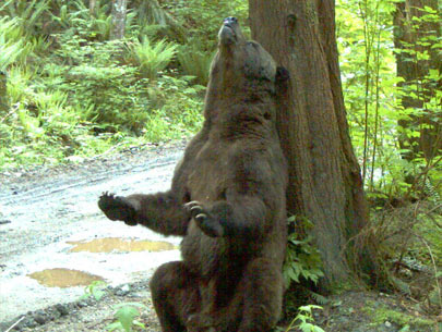 In 2009, I began my PhD research based at Knight Inlet Lodge, studying the function of scent marking in grizzly bears. To establish this, we set up camera traps in the forest surrounding the Glendale river estuary and documented natural scent marking behaviour in grizzly bears of different age and sex classes across different seasons. Using this non-invasive approach, we established that scent communication in a high density population of grizzly bears functions to communicate competitive ability between adult males and therefore plays an important role in breeding and survival. We also found that grizzlies are selective in the location, species and size of tree on which they place their scent marks to make their scent more conspicuous to other bears. These findings have since been published in internationally-recognised academic journals (PLoS ONE and Animal Behaviour) and presented at international conferences such as the International Conference on Bear Research and Management and International Behavioural Ecology Congress.