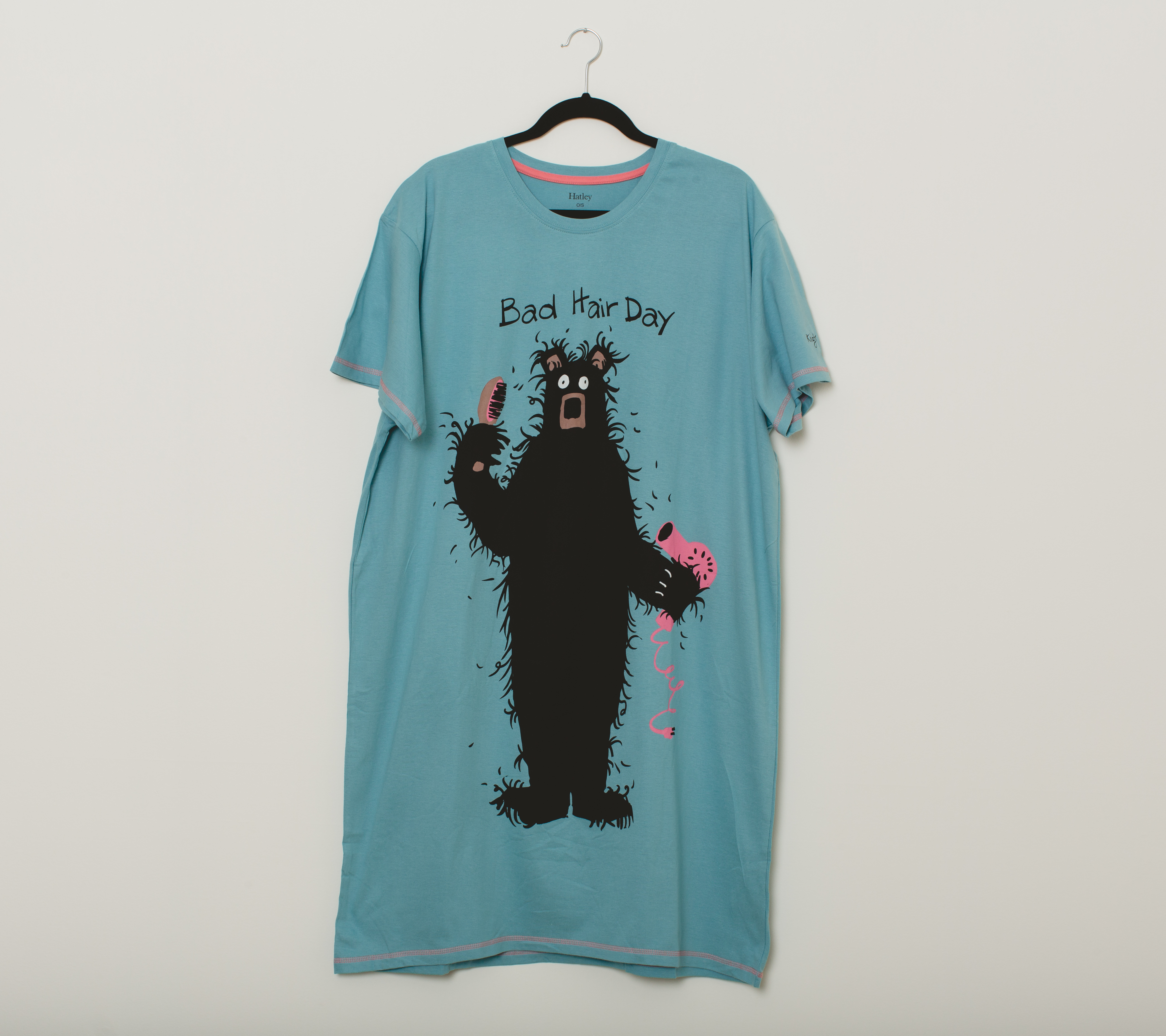 Playful shortsleeved nightshirt. 100% Cotton, soft and cozy for sleeping and for sleepy heads lounging after a long day in the pristine wilderness surrounding Knight Inlet Lodge