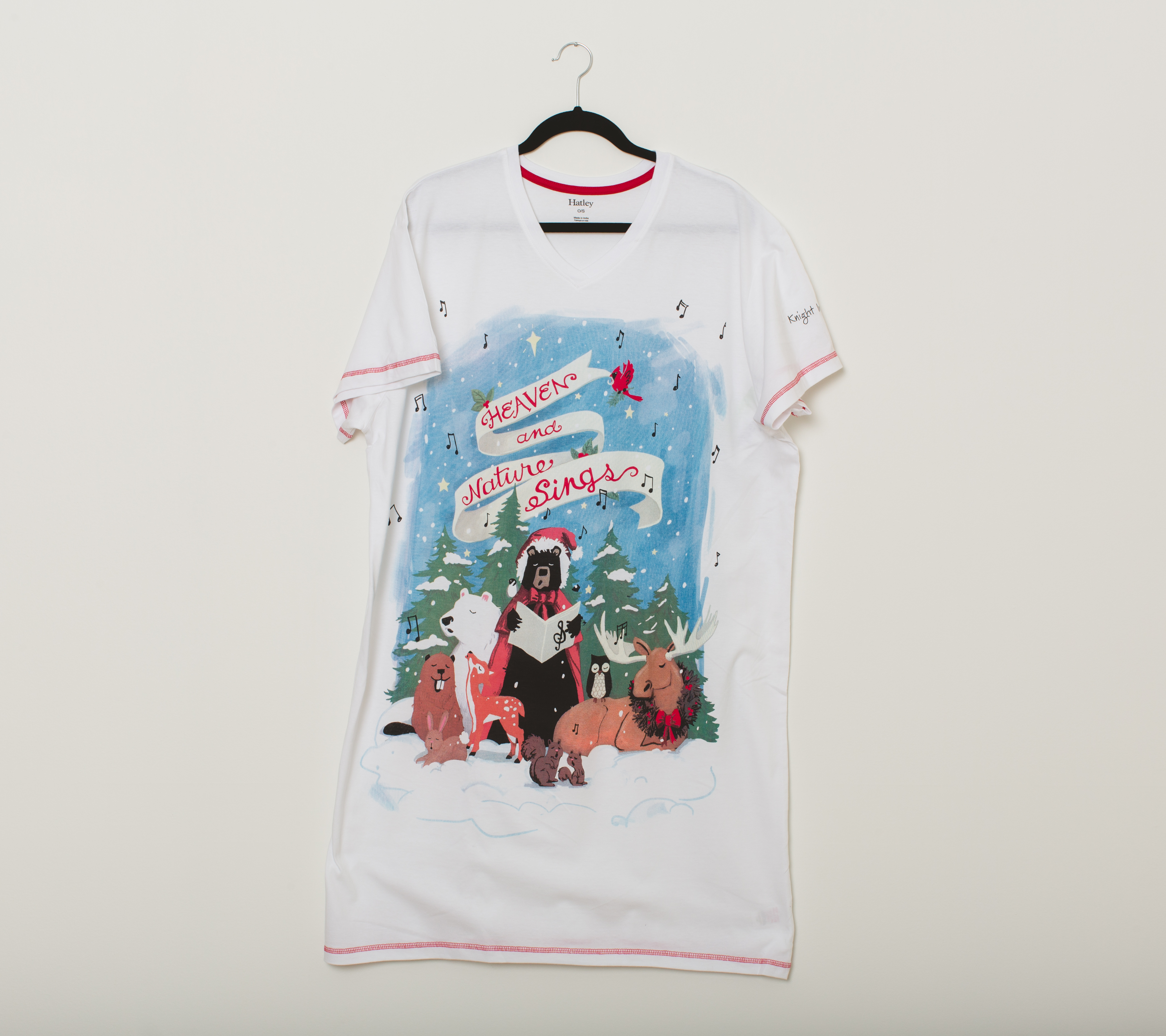 Playful shortsleeved nightshirt. 100% Cotton, soft and cozy for sleeping and for sleepy heads lounging after a long day in the pristine wilderness surrounding Knight Inlet Lodge